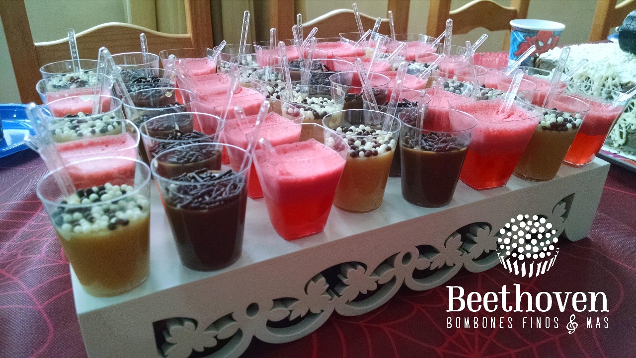 Pequeños y delicados vasitos con postre a elección: brigadeiro de chocolate de leche, brigadeiro de chocolate blanco con cereal, dulce de nueces, gelatina de frutilla con crema de leche, mousse de maracuyá, mousse de chocolate amargo.
